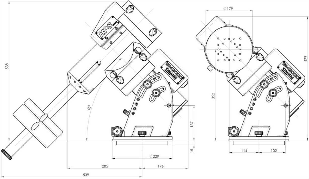 - Security stop: +/− 30° past meridian in r.a. (software), +/− 45° past meridian in r.a. (mechanical)