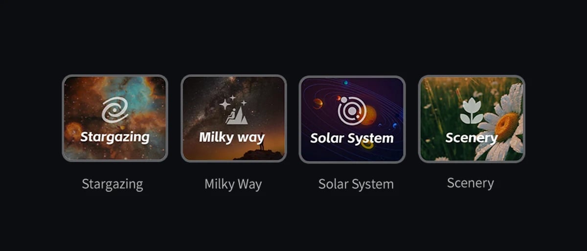 These filters allow effective imaging of emission nebulae even from suburban and urban locations. Mode include Stargazing, Milky Way, Solar System and Scenery for easy one tap settings for different capture scenarios. Single tap post processing options make processing your images as easy as possible with stunning results.