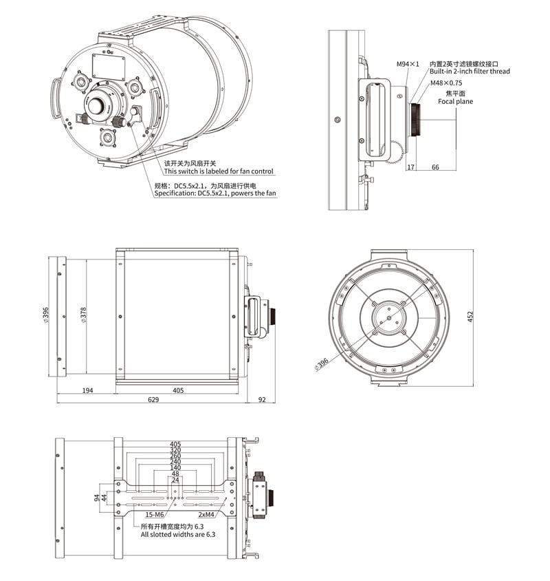 A front-mounted 360° rotator on the focuser prevents cable tangling during use. At the rear, multiple threaded adapters (M68, M54, and M48) ensure compatibility with a wide range of imaging equipment. The M48 adapter includes an integrated 2-inch filter thread for direct filter installation.
