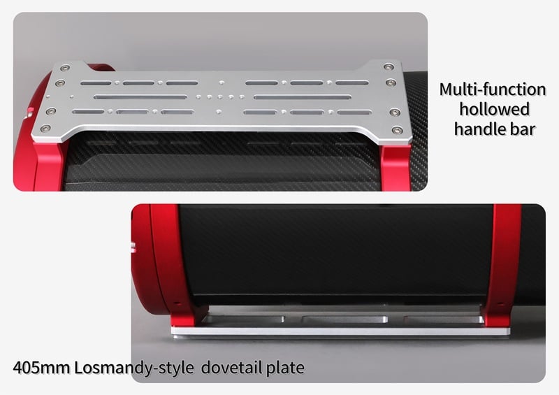 A hollow top handle allows for easy transport, while its multi-slot design supports the attachment of various accessories. The bottom is fitted with a 405 mm Losmandy-style dovetail plate, compatible with most equatorial mounts. Fully CNC-machined with a widened, reinforced profile, it provides secure and reliable mounting.