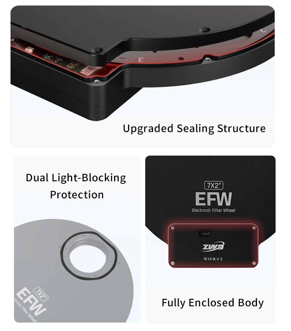 The latest generation of the ZWO filter wheel incorporates enhanced light-leak protection, ensuring optimal image quality by minimizing stray light intrusion. The redesigned housing features a slot-style closure and a fully sealed motor compartment, effectively eliminating gaps between sections where light could penetrate. Additionally, the traditional masks have been replaced with new light-blocking pads, providing a secure, light-tight seal in bolt-through configurations while simplifying installation.