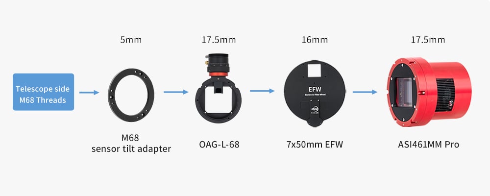 The ZWO EFW 8-Position Filter Wheel for 1.25" and 31 mm Filters (2025) is designed for flexible integration, whether in a visual back configuration or a fully threaded optical train. The kit includes adapters compatible with ZWO camera packages, allowing seamless installation with both Pro cooled and uncooled cameras. By following the system chart below, you can configure either a 1.25" imaging setup or a threaded train based on the industry-standard backfocus. It is also compatible with cameras featuring similar native backspacing; however, additional spacers or adapters may be required for non-ZWO systems.